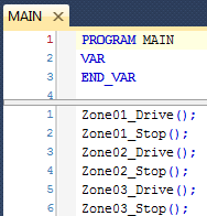Every time you create a new program you have to remember to call it from MAIN. If you don’t, the logic won’t execute and this can be difficult to debug. Thankfully, TwinCAT 3 will give you a hint that you made this mistake. As an example, I’m going to comment out the line where I call Zone02_Stop from the MAIN program: